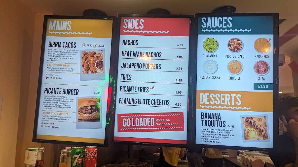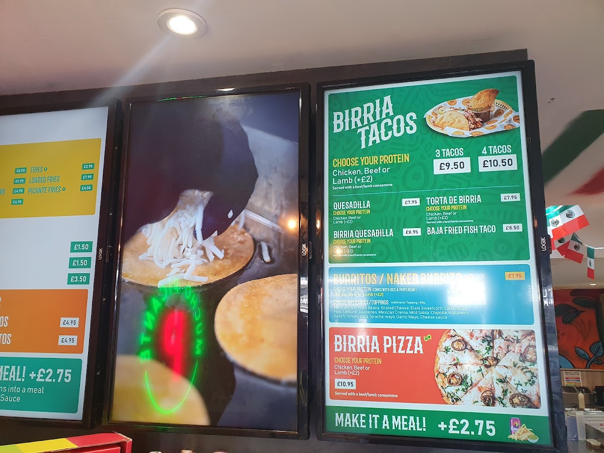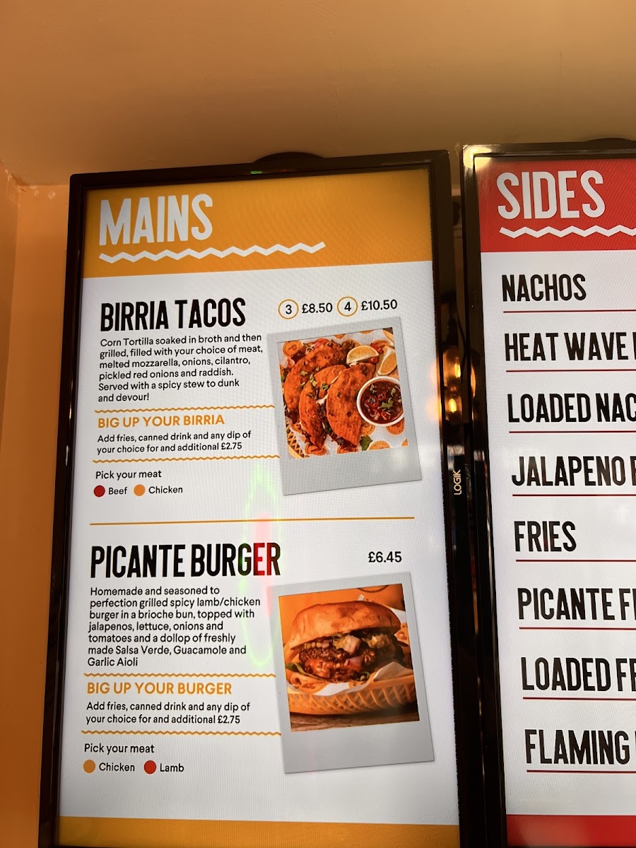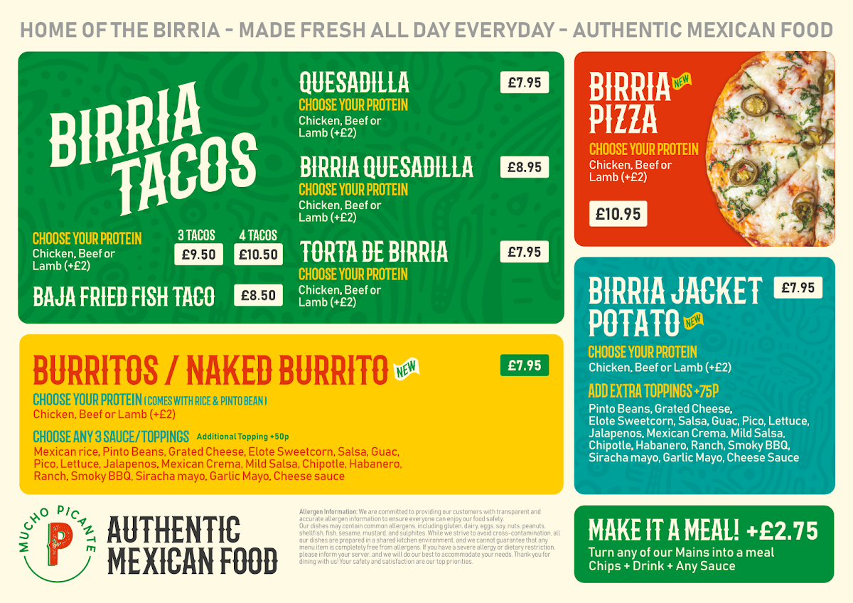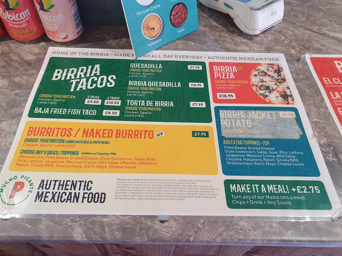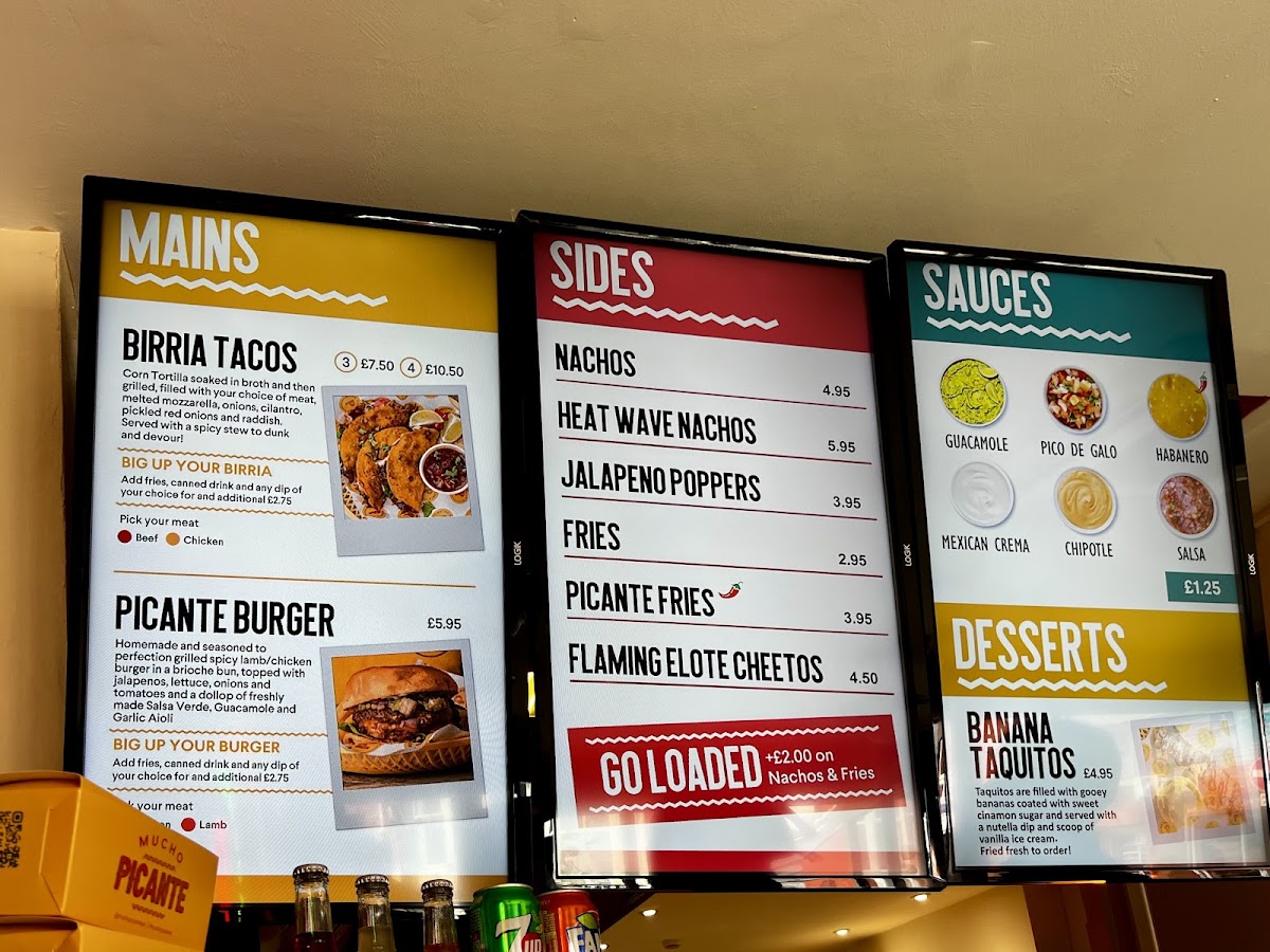 The menu at Mucho Picante offers a range of Mexican-inspired dishes primarily designed for takeout, with limited seating available. It features a variety of tacos, including Lamb Birria and Beef Birria options, alongside other traditional items such as burritos and quesadillas. The menu also includes several sauces like guacamole, Mexican crema, and pico de gallo to complement the dishes.